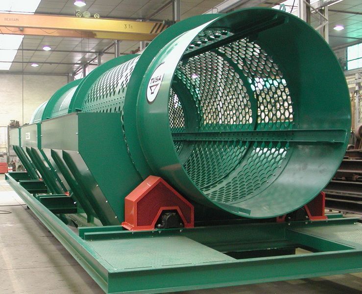 Este tambor es un cilindro metálico formado por mallas o chapas perforadas que gira sobre su eje: el resultado es un cribado de material, que consigue separar los sólidos por tamaño.